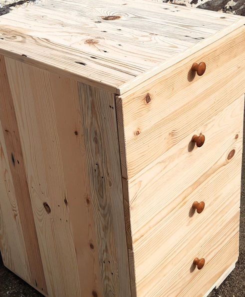 Pin massif issu de palettes revalorisées. Les palettes utilisées n'ont reçu aucun traitement chimique. Elles proviennent de diverses entreprises et déchetteries partenaires, et sont récupérées après une première utilisation – leur unique utilisation prévue normalement.